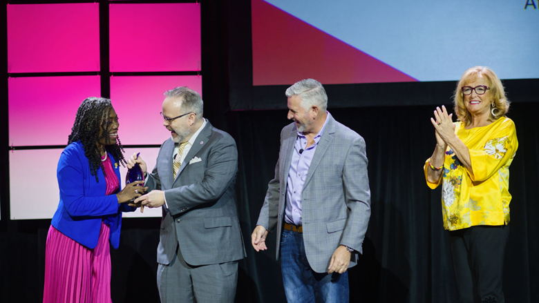 Renee Sattiewhite (left), CEO and President of the African-American Credit Union Coalition, is the 2023 winner of the inaugural Neoteric Changemaker Award. Presenting the award are: (left to right) Honorable Todd M. Harper, Chairman, NCUA; Dennis Sullivan, Chairman, CU Leadership Convention; and Susan Mitchell, CEO, Mitchell, Stankovic & Associates.
